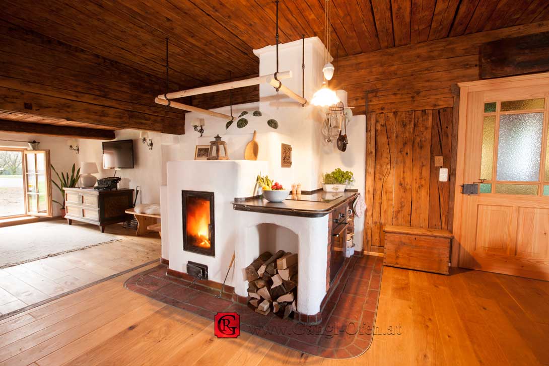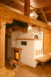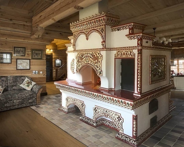 В двухэтажных домах можно использовать такой вид отопления. Но необходимо устроить прочное перекрытие, которое может выдержать тяжелую кирпичную постройку. Обязательно нужно располагать духовку, варочную плиту и лежанку на первом этаже. На втором этаже можно устраивать только отопительный щиток. Если дом имеет только одну большую комнату, то печь можно установить в самом центре. Таким образом, она будет разграничивать пространство и разделять кухню от гостиной.
