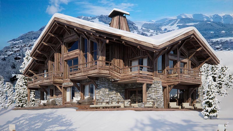 Шале — это дом из грубого бруса с высоким каменным фундаментом, двускатной крышей, просторными балконами. Внутри коттеджа много солнечного света, потолки снабжены деревянными балками, а в гостиной есть камин из натурального или искусственного камня.