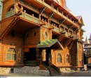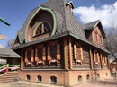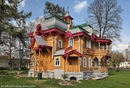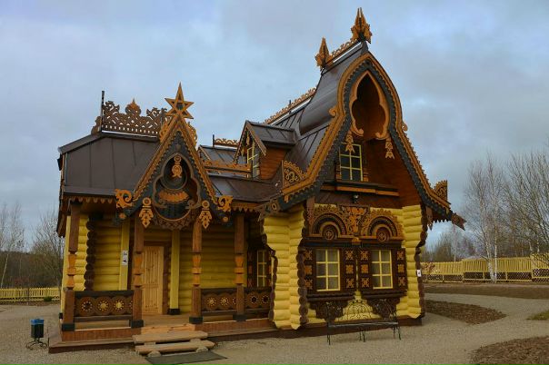 Деревянный дом, щедро украшенный резными элементами, напоминает настоящий терем из сказки.