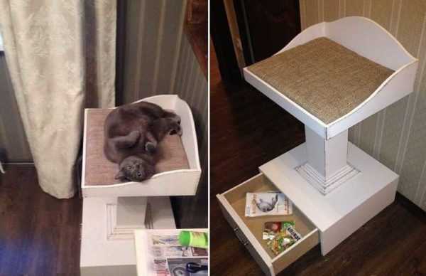 Котик в домике должен чувствовать себя защищенным, поэтому идея замаскировать жилище любимца под интерьер понравится и заводчику, и питомцу. Одним из вариантов такого дома может быть нижний ящик комода, который вы освободите для кота и положите туда лежанку и 2-3 игрушки. На фронтальной панели необходимо сделать отверстие для двери, чтобы ваш любимец не оказался в ловушке. В любой мебели можно организовать пространство для животного, но необходимо до мелочей продумать вопросы безопасности питомца.