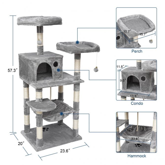 - Тренажер слишком скучный для животного. Необходимо сделать его привлекательным, повесить игрушки, с которыми кот играет, например, искусственных мышей, перья. Многие домики оборудованы, помимо постели и платформы, на которых сидит кот, домами или туннелями, где питомец сможет укрыться. Чем больше аттракционов, тем лучше, ведь кот – животное, обожающее прятаться, наблюдая за окружающими из засады.