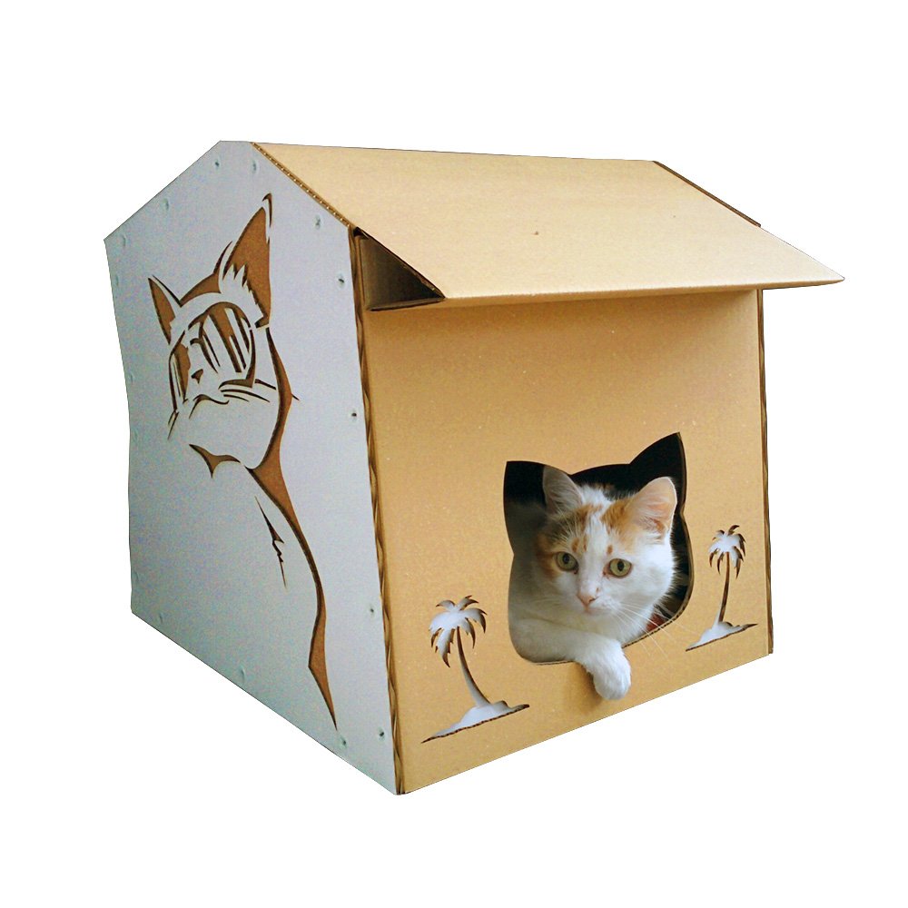 Картонный кошачий домик похож на пляжную хижину, его легко собрать, он сделан из прочных материалов и включает блокнот для царапин.