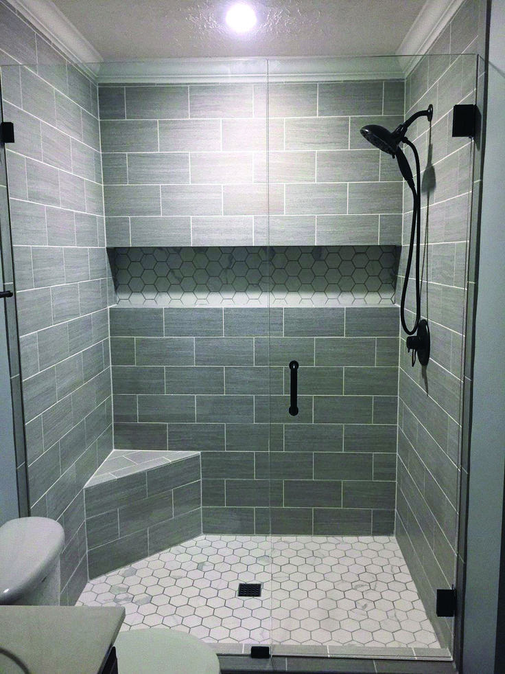 На фото плитка кабанчик серого цвета с горизонтальной раскладкой со смещением в душевой.