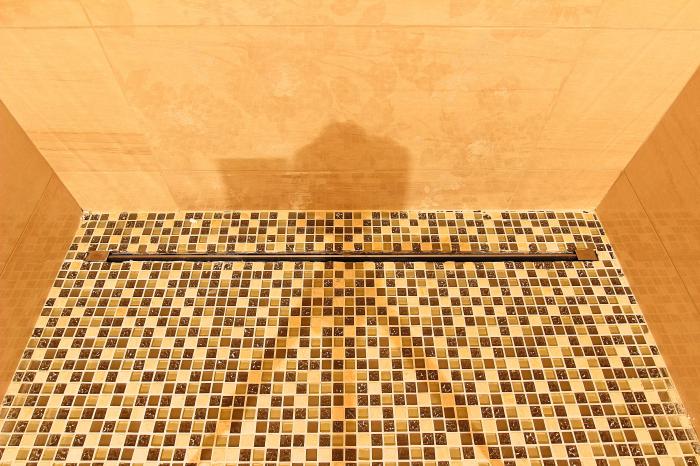 В данном случае используют облицовку, контрастирующую с общим оформлением помещения, тем самым выделяя душевую зону или применяют однотипную крупноформатную плитку, подходящую для пола без перепадов высоты. Таким образом получается зрительно увеличить пространство и придать ему очень солидный облик.