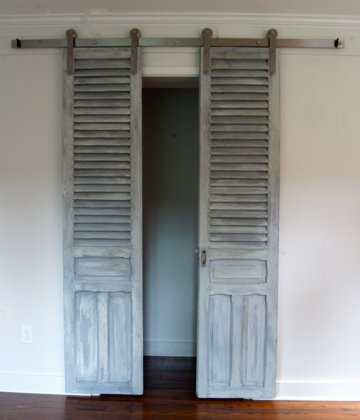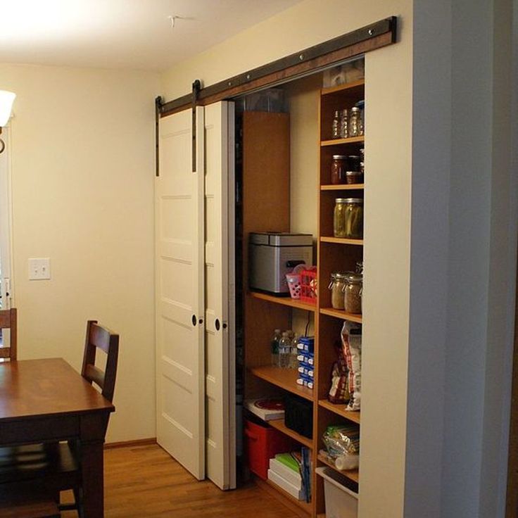 Любители амбарных дверей радуются: амбарные двери можно установить и во встроенные кладовые. Узкая дверь и стержень могут быть установлены поверх полуоткрытого шкафа, чтобы получить вид двери кладовой.