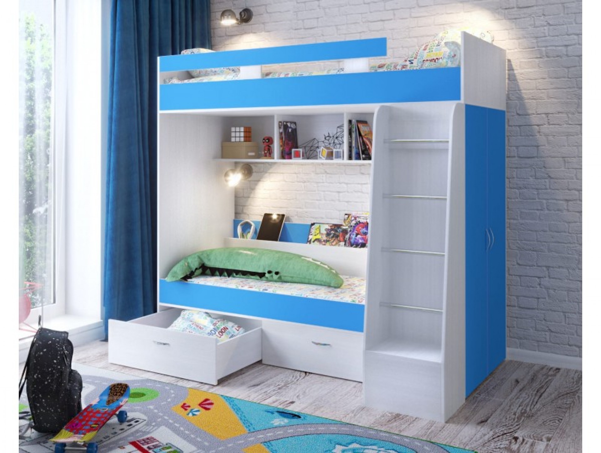 45. Сине-белая двухъярусная кровать с письменным столом и местом для хранения