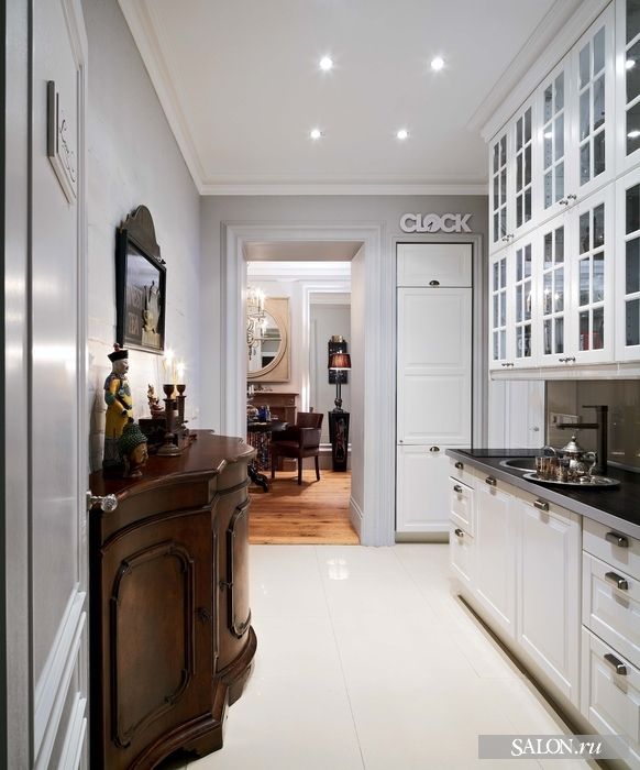 Вид из гостиной на кухню. Двери и дверные порталы со стеклянными вставками изготовлены на заказ.