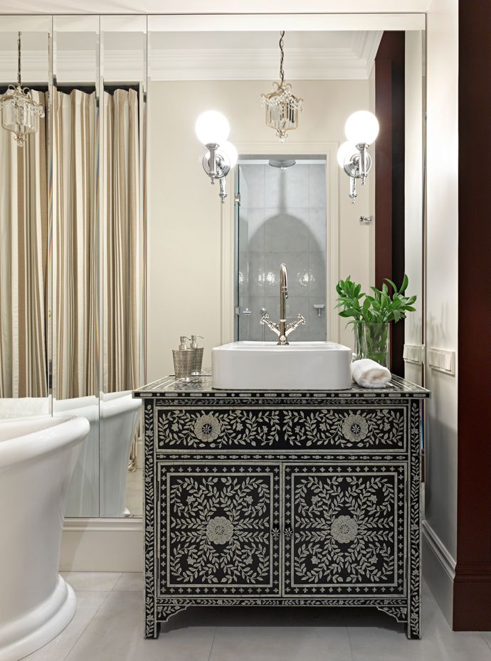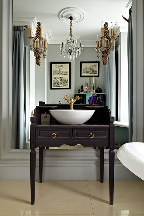 Шкафы и тумба под раковину сделаны по эскизам дизайнера. Зеркало, антиквариат.