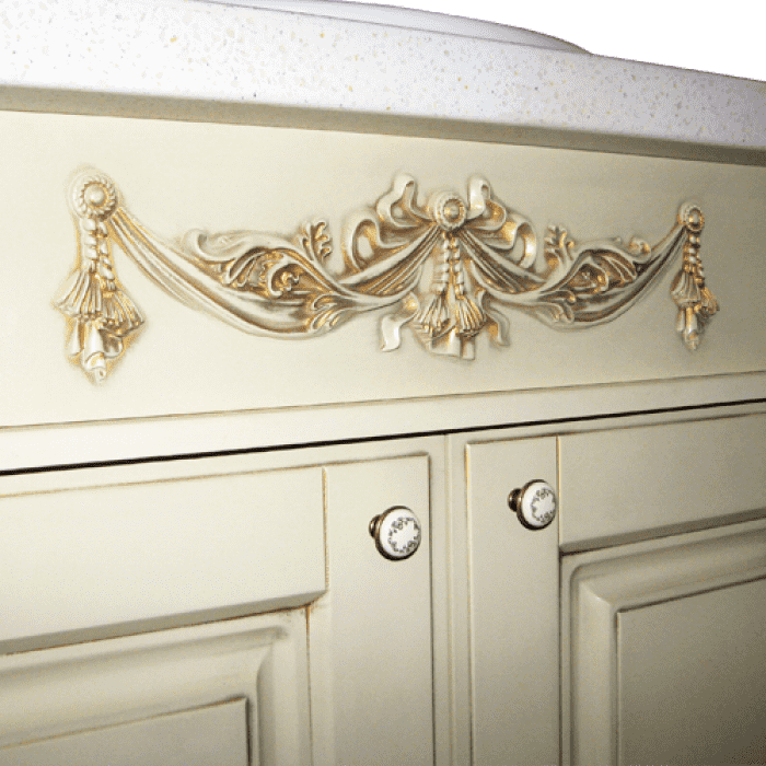 Розетками, уголками, коронами и другими элементами различного дизайна и размера часто украшают мебель в классическом стиле. Они выполняются плоскими с одной стороны для удобства крепления, окрашиваются в одном тоне с фасадом или в другой цвет, отличаются изящной резьбой высокой точности.