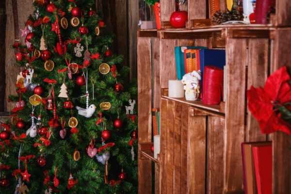 Выбирая эко-стиль, будет уместно изготовить ёлку самостоятельно, а не срубать живое дерево. В ход идут коряги, книги, деревянные доски, гирлянды, пряжа, фрукты, шишки — всё, что придет на ум. К этому творческому процессу можно приобщить детей. Им будет очень интересно повозиться с шишками, веточками или украшать елку лимонными дольками и пряниками.