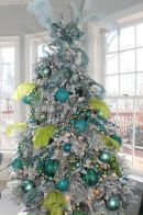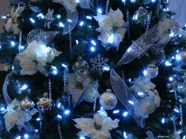 Серебристо-белый декор выглядит очень эффектно на лесных красавицах с голубоватой хвоей.