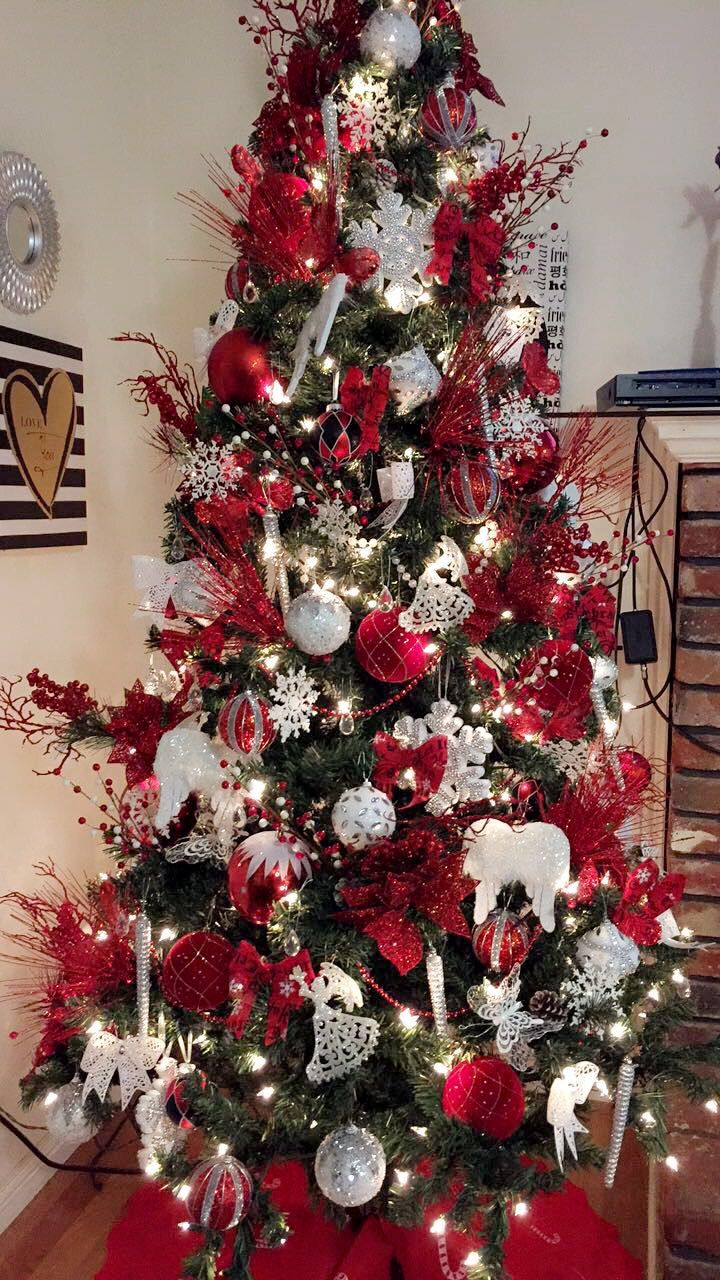 Елка в красно белых тонах: Елка в красно белом стиле (64 фото)
