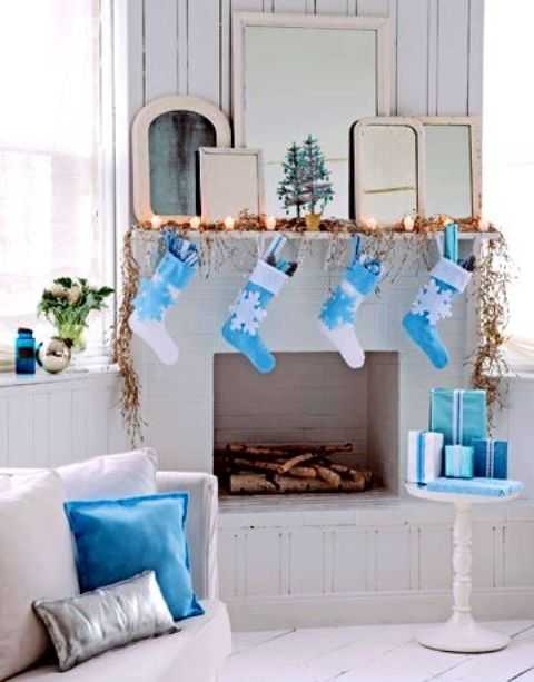 Хрустящая бело-голубая вуаль может быть где угодно. Сине-белые украшения, гирлянды, венки из искусственных веток, искусственный снег, чулки на камине, снежинки, шишки и снежки превратят ваши полки и камин в праздничное место. Свет и свечи добавят тепла и уюта.