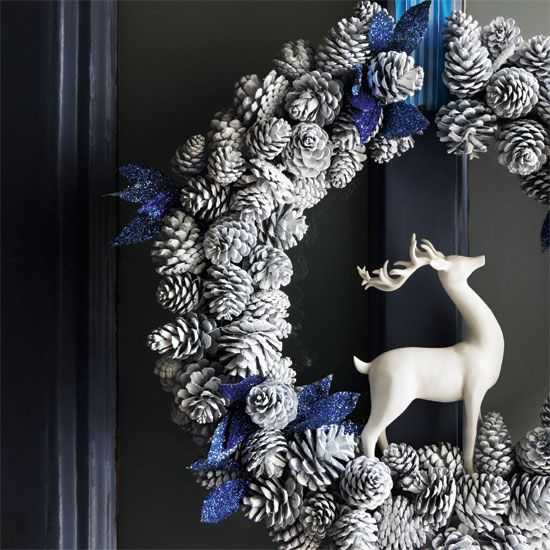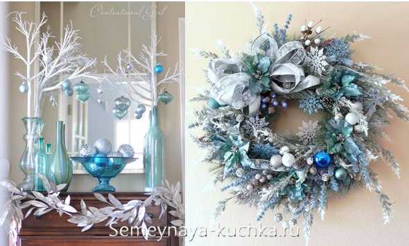 Венок является популярным украшением. И Новый Год – не исключение. Купите свой собственный венок из синих и белых украшений, украсьте его снежинками, сделайте голову снеговика, добавьте шишки, ягоды и все, что попадется под руку. Украсьте двери, стены, да что угодно!