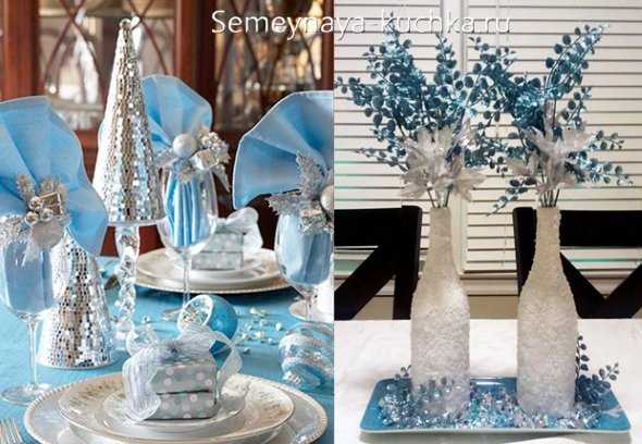 С белым сочетается любой оттенок синего. Вот ниже пример как небесно-синий цвет красиво мерцает на фоне белоснежной елки и скатерти стола, сервированного на Новый Год.