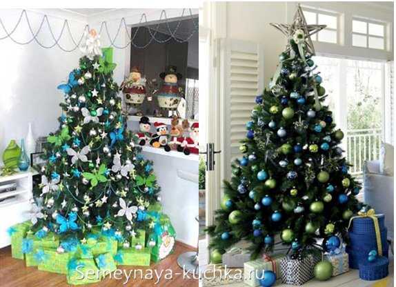 Вот несколько фото-примеров того как красиво смотрится контраст синего с фисташково-зеленым. Теплый цвет зелени уравновешивает холодный синий – и получается приятная для глаз гамма – которая задает веселое настроение всему интерьеру Нового Года. Помимо елки можно сделать украшения для