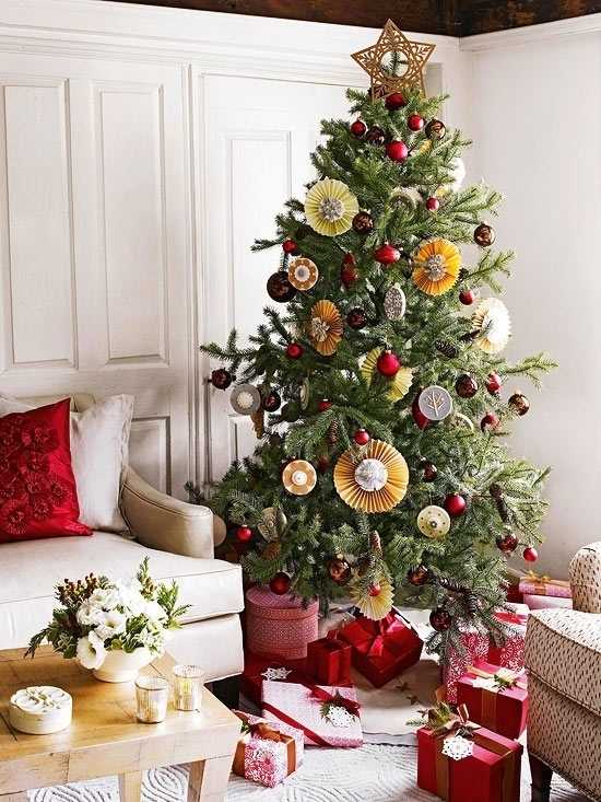 Бумажные медальоны и классические украшения красного цвета создают праздничное настроение. Такая елка выглядит просто и по-домашнему тепло.