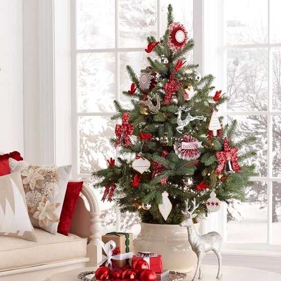 Благодаря большим красным украшениям маленькая новогодняя елка производит большое впечатление.