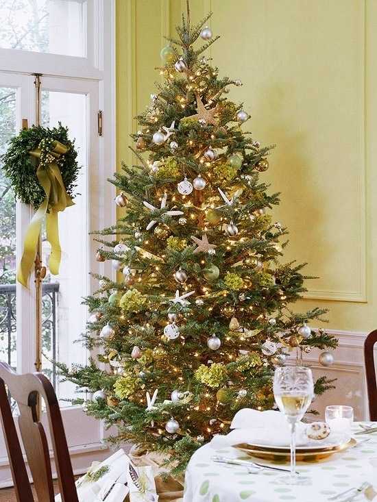 Добавьте воспоминание о море к новогодней елке с помощью нежных белых морских звезд и лимонного цвета гортензий.