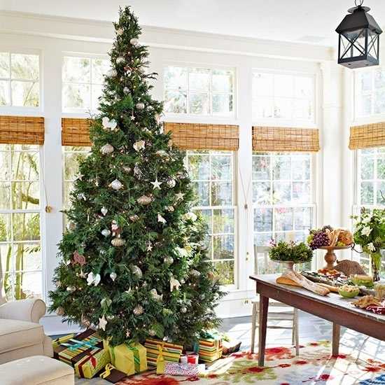 Украсьте нейтральную комнату радугой металлических украшений на новогодней елке. Эта великолепная картина доказывает, что стоит повозиться с украшением большой ели.