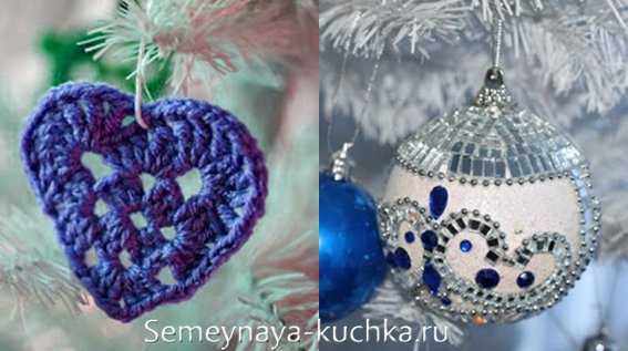 Вы можете сделать СИНИЕ УКРАШЕНИЯ для вашей елки – связать вот такое синее сердечко… или сделать такую нарядную синюю мозаику на белом шаре (мозаика делается из кусочков нарезанного СD-диска) Мастер-класс по изготовлению таких елочных игрушек я описала в статьях:
