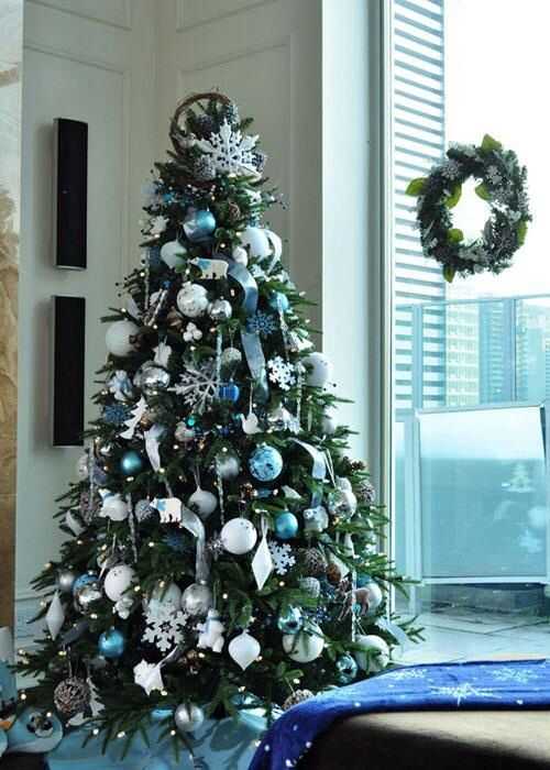 Оттенки небесно-голубого цвета выделяются на темно-зеленой новогодней ели. Это идеальное сочетание цветов для тех, кто предпочитает нетрадиционный стиль украшений.