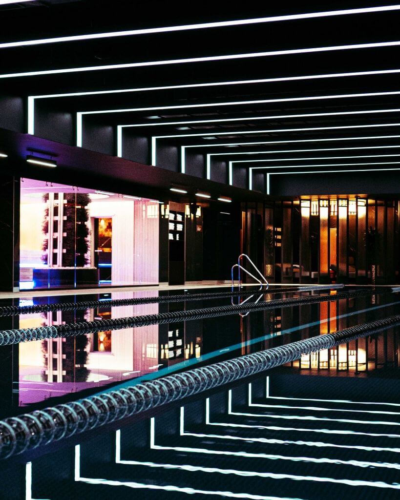 Дизайн от архитектурного бюро Александра Паркина с большими панорамными окнами и естественным освещением, бассейн и зона релаксации, похожие на роскошный арт-объект, создают ощущение присутствия в ином, фантастическом измерении. Выразительная геометрия форм и четкость линий здесь сочетается с обтекаемыми изгибами и глянцевыми поверхностями.