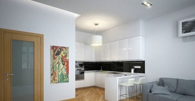 Например, в небольшое пространство 20-30 м, желательно выбирать компактный кухонный гарнитур, а зону отдыха и приготовления пищи разграничивать барной стойкой. Ее можно совместить с обеденным столом. Обратите внимание на Г- и П-образные столешницы, диваны и шкафы.