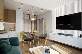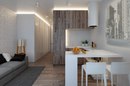 Такое современное жилье будет удобным для людей любого возраста, не заинтересованных в отдельной кухне (под эту зону обычно выделено немного места). Оно подойдет и для пар с совсем маленькими детьми. Под детскую можно отвести спальню, а в гостиной обустроить складное спальное место с нишей под вещи или же отгородить уголок под постель ширмой. Мы подобрали несколько фото для примера.