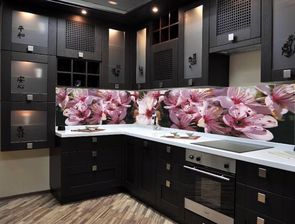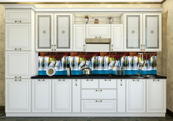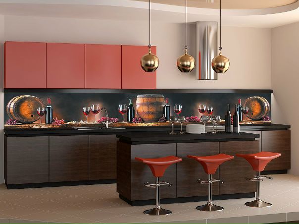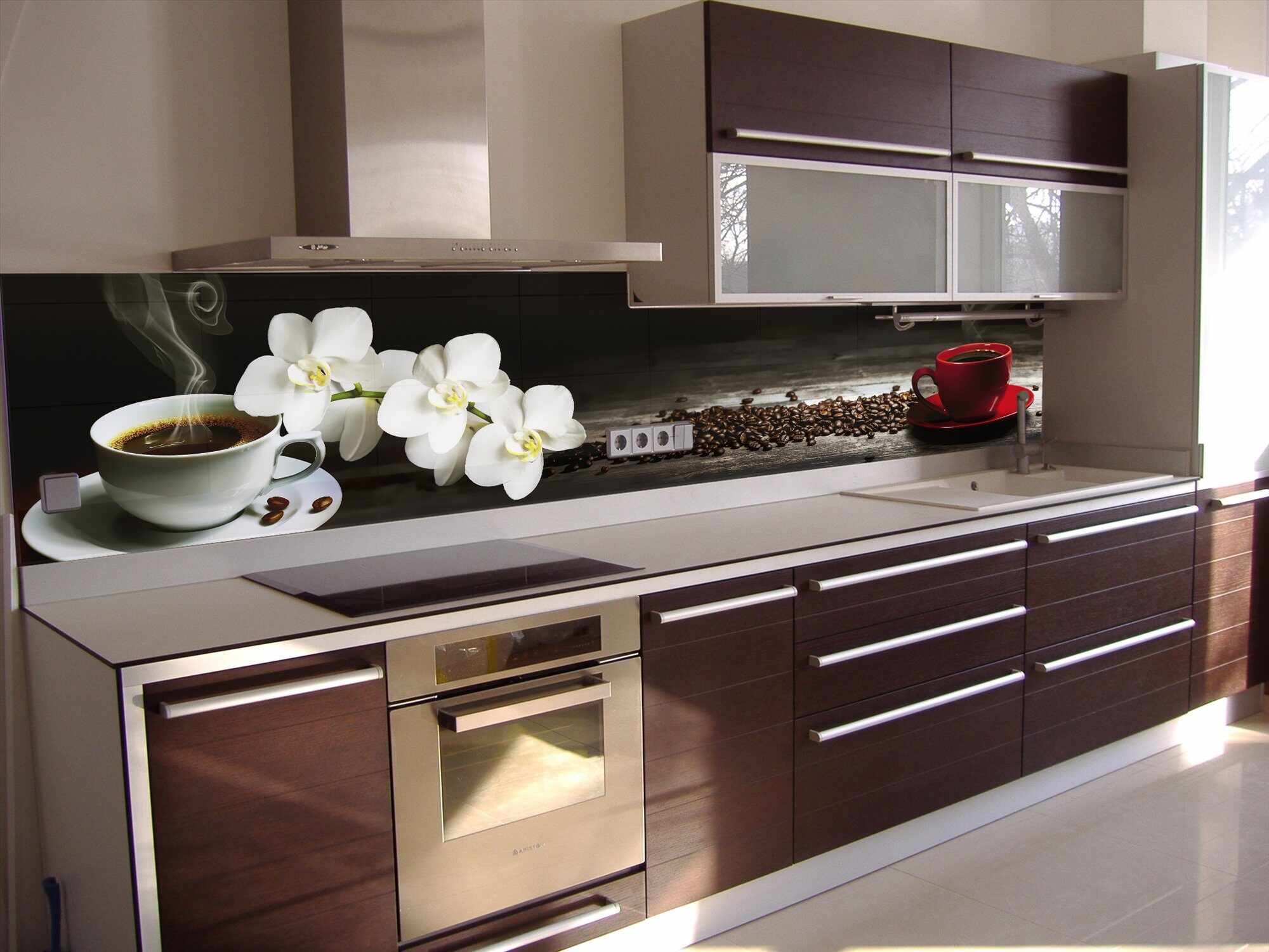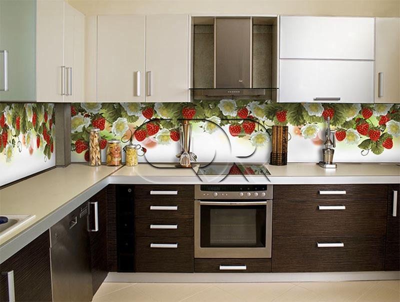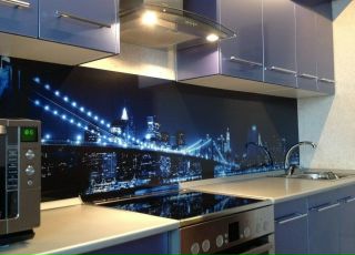 При желании обустроить стеклянный фартук на кухню, воспользуйтесь техникой фотопечати. На обратной стороне стекла наносится любой узор, рисунок или фотография. В сочетании со стеклом такой вид фартука носит название скинали.