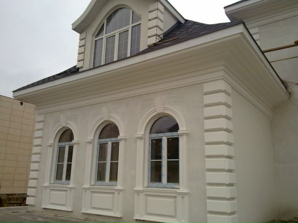 Современный декор фасада представлен в виде элемента декора — профиля, в большинстве случаев изготавливаемого из пенополистирола, длина которого нередко достигает от 1 до 2 метров.