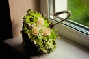 - Собранный букет повторно крепко фиксируется лентой, проволокой или жгутом, после чего лишние концы обрезаются секатором. После этого ножом обязательно подрезаются наискось стебли, иначе букет не будет пить воду и не простоит долго.