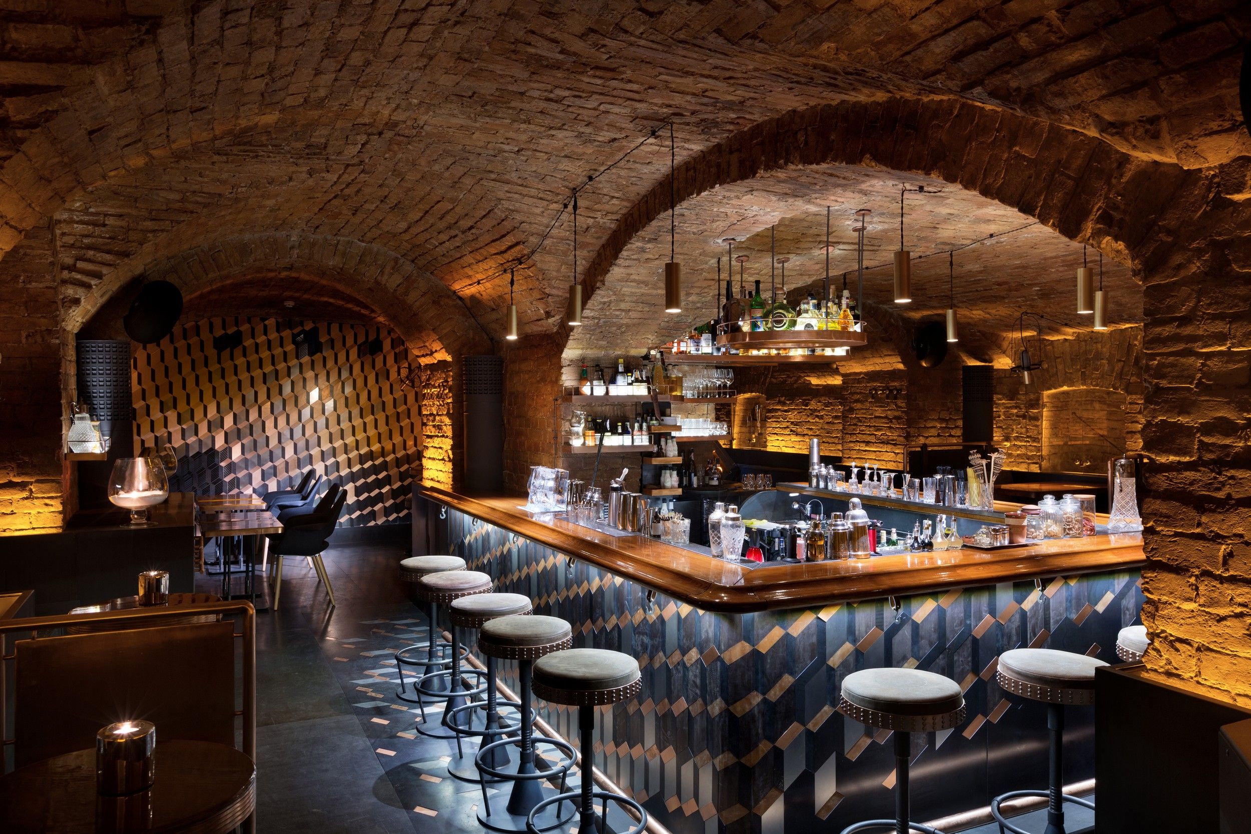 Уютное пространство создается благодаря креативной отделке стен, живым растениям в глиняных горшках, резным столешницам из натурального дерева, мягкими диванами и приглушенному свету ретро-ламп.