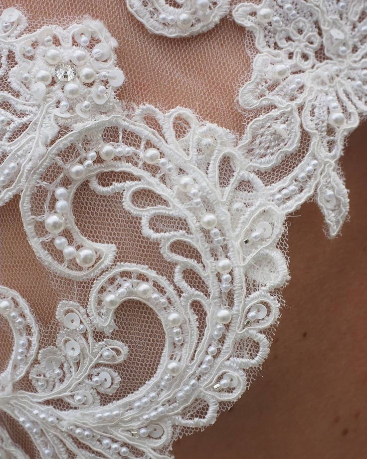 Hand beruhrt Perlenarbeiten und Spitze Nahaufnahme auf einem weiΓen Brautkleid. SchΓΆner Schmuck fΓΌr das Outfit der Braut. Hochzeitsvorbereitungen. Kleidung Π΄Π΅ Brautpaares. Kleine glΓ€nzende Details auf dem Kleid, handgefertigt
