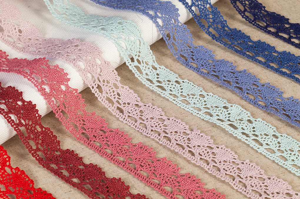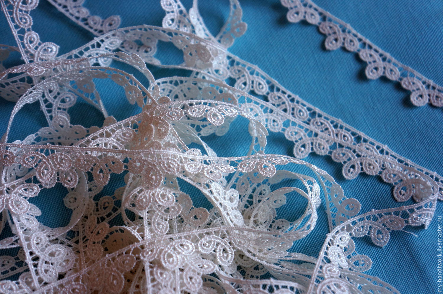 Juteband mit hellblauer Spitze auf weiΓem Hintergrund, Draufsicht