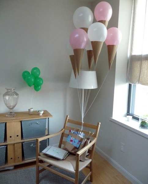 - Для детского праздника можно сделать на день рождения прикольный подарок из шариков с использованием цветной бумаги. Для этого берут яркие разноцветные шары и подбирают в тон к ним подходящую цветную бумагу. Затем бумагу сворачивают конусом и крепят к основанию шара. Благодаря таким простым действиям обыкновенные предметы становятся похожими на мороженое, которое будет приятно получить маленькому имениннику.