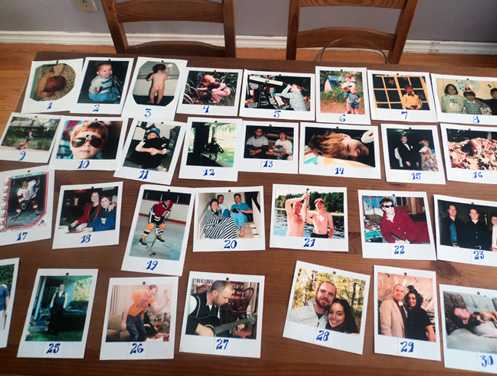 По количеству лет были куплены гелиевые шары и распечатаны фотографии именинника — в разных возрастах — ежегодные. От младенческих до последних, взрослых.