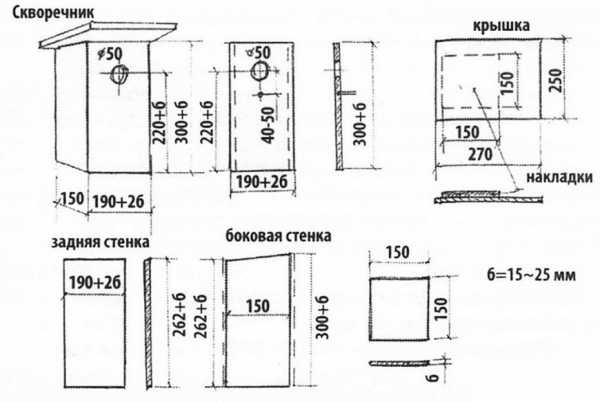 Некоторые чертежи скворечников есть по тексту, еще несколько выкладываем в этом разделе. Подправить размеры под планируемых «жильцов» наверняка не проблема. Также обратите внимание, что раскладка дана для доски толщиной 2 см. При увеличении или уменьшении толщины необходимы коррективы.