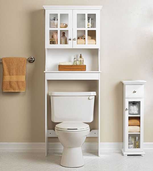 Можно сделать на заказ стеллаж или шкаф и поставить его за унитазом. Это выглядит так, словно унитаз встроен в предмет мебели. Удобно, если в квартире маловато места для хранения различных бытовых предметов.