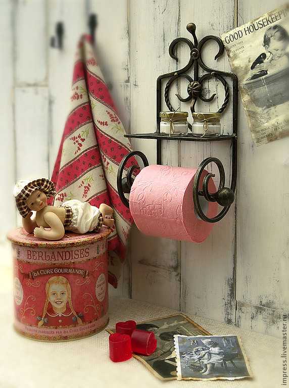 Если в туалете есть ниша, к примеру, с нагревателем, то ниже обогревателя можно поместить еще один шкафчик для запасов туалетной бумаги и других нужных вещей. Еще одну полку можно разместить выше бачка унитаза, все равно место там пустует. Для небольших туалетов рекомендуем сделать яркое освещение — оно зрительно увеличит объем помещения. Все приспособления в туалете (от смесителя до держателя туалетной бумаги) представлены в магазинах в широком ассортименте. Держатели изготавливают разных конструкций. Это могут быть обычные пластмассовые держатели или бронзовые фигурки животных или сказочных персонажей. Выбирайте все на свой вкус.