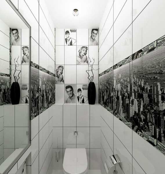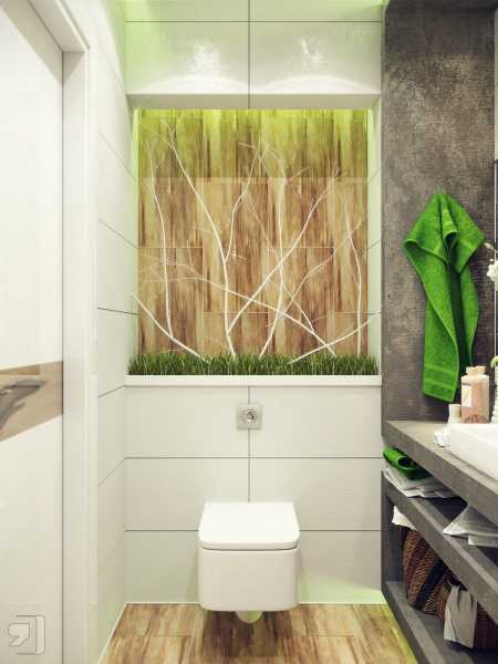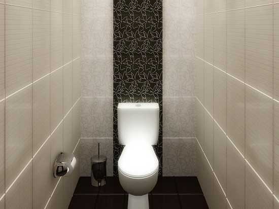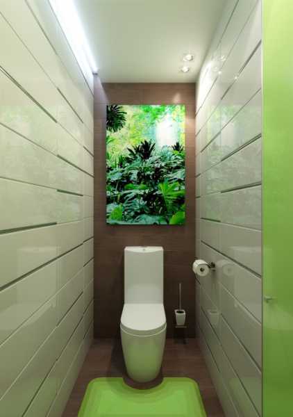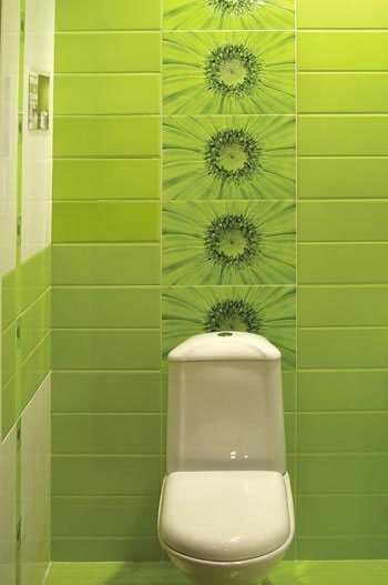 Если туалет в квартире выглядит как узкий и длинный «туннель», хорошим решением станет деление стен по горизонтали. Примерно на одну треть или на половину высоты стена облицовывается плиткой одного цвета, а выше — другого.