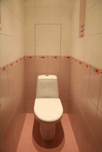 Если вы ремонтируете туалет в малогабаритной квартире, стоит выбирать отделку для него светлых тонов: белого, голубого, серебристого, розового, бежевого. Может понадобиться и терракотовая зеркальная плитка. Она лучше подойдет для больших туалетных комнат. Если вас очень привлекает мысль использовать яркие цвета, лучше учтите это при выборе сантехники — купите яркие унитаз и раковину. Если туалет имеет небольшую площадь, как обычно и бывает в домах массовой застройки, не стоит использовать крупные рисунки при отделке помещения туалета. Если вы все-таки хотите обои с рисунком, лучше, чтобы он был вертикальным, что визуально увеличит высоту потолка. Если же потолок, напротив, слишком высокий по сравнению с шириной туалета, выложите стенки до высоты своего роста. Для узкого туалета лучше выбирать четырехугольные материалы и класть их длинной стороной к наиболее узкой стене.