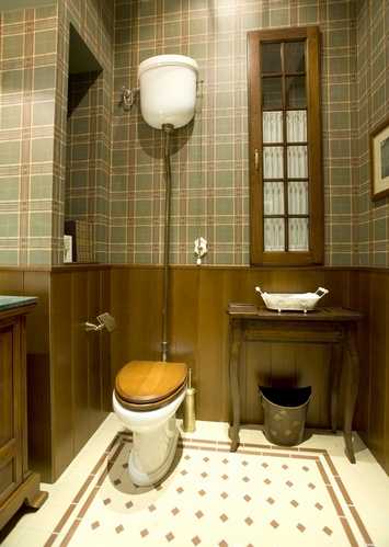 Отделка туалета в подчеркнуто английском стиле выглядит оригинально и ярко.