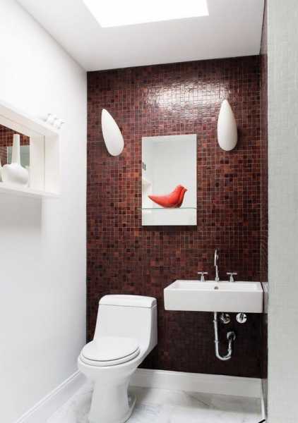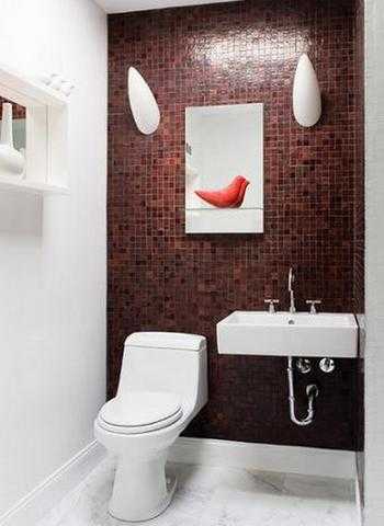 Очень эффектно и ярко выглядит облицовка стен белой плиткой в сочетании с насыщенной тёмно-бордовой мозаикой. Наличие зеркал и мраморного напольного покрытия создают великолепный тандем с контрастными стенами туалета.