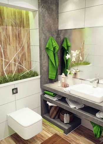 Мозаику применяют обычно фрагментарно, для выделения зон. Галька — материал тоже акцентный. Его используют для декора поверхностей. Закаленное стекло применяют для создания своего рода «фартука», аналогичного тому, который присутствует в кухонных рабочих зонах. Стены в этом случае могут быть окрашены или оклеены обоями. Поверх отделки крепится стекло. Так оформляются стены до половины высоты — то есть стекло защищает те участки, которые подвергаются максимальному загрязнению.