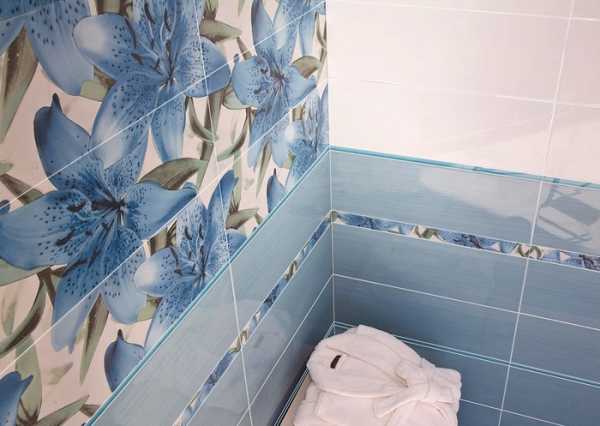 Еще один вариант с аналогичным эффектом визуального снижения высоты и увеличения ширины: стены облицовываются плиткой одного цвета, но на некоторой высоте от пола вводится контрастная плитка или плиточный декор. Получается цветная полоса по периметру помещения. При этом полос-вставок может быть несколько — располагать их следует на разной высоте.