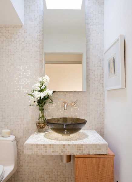 Для малых санузлов отличным выбором является керамическая плитка в светлых тонах. Чтобы создать интересный интерьер можно использовать мозаику. Светло-бежевая палитра мозаичной плитки поможет создать комфортную обстановку. Кремовый керамогранит для напольного покрытия станет идеальным дополнением.