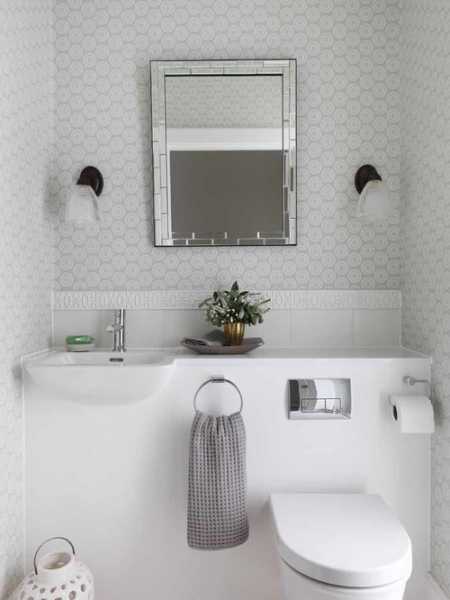 Визуально расширить туалет поможет настенное зеркало. Его можно просто повесить над раковиной или превратить в отделочный элемент, «встроив» в плиточную отделку.