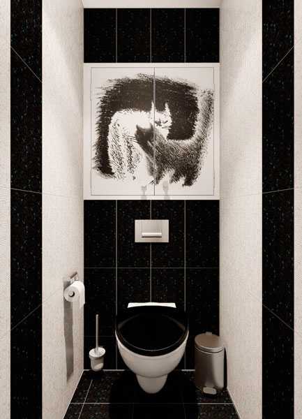 Туалет в квартире отличается, как правило, компактностью. Поэтому здесь стоит руководствоваться старым добрым правилом, гласящим, что темные цвета визуально уменьшают помещение, а светлые — «распахивают». Таким образом, неразумно будет использовать для маленького туалета темные цвета в большом количестве. А в малом — можно. Если, например, вы хотите сделать туалет черно-белым, возьмите побольше белой плитки, а черную используйте в качестве акцентных фрагментов и вкраплений.