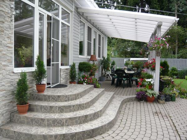 Такую пристройку обычно обращают в сторону сада и делают с «открытой» стеной, чтобы любоваться прекрасной картиной природы, ощущать запахи цветов и растений, слушать пение птиц. Так как это пространство часто является частью дома и имеет две или три полноценные стены, то обстановка здесь может быть приближенной к домашней. Здесь можно сделать и вход в баню.